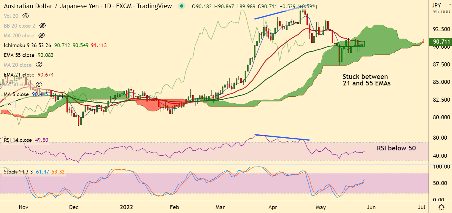Summary: AUD/JPY trades within tight ranges between 55 and 21 EMA. Breakout required for clear direction.