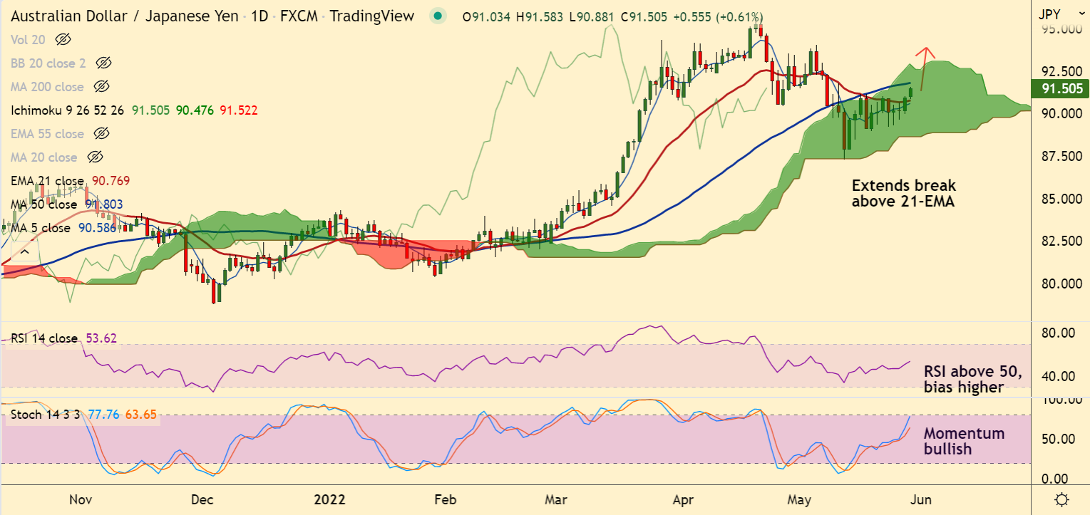 - The pair is extending break above 21-EMA, scope for further upside