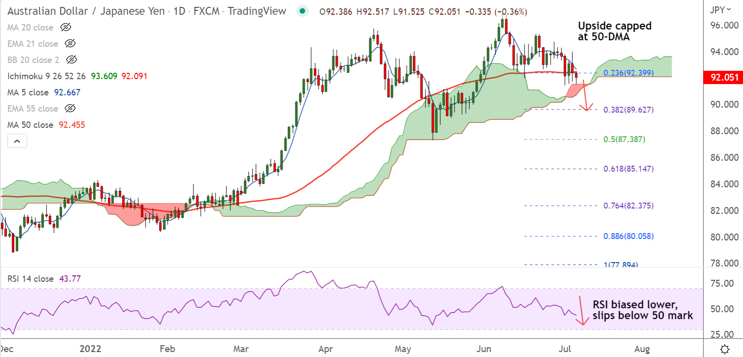Summary: AUD/JPY bias remains bearish as long as pair holds below 55-EMA. Technical indicators are bearish. Scope for test of 110-EMA at 90.34.
