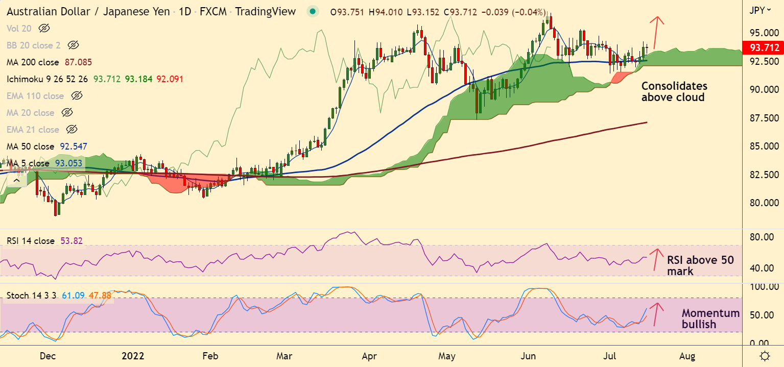 Summary: AUD/JPY consolidates above major support levels. The pair is poised for upside resumption. Weakness only below daily cloud.