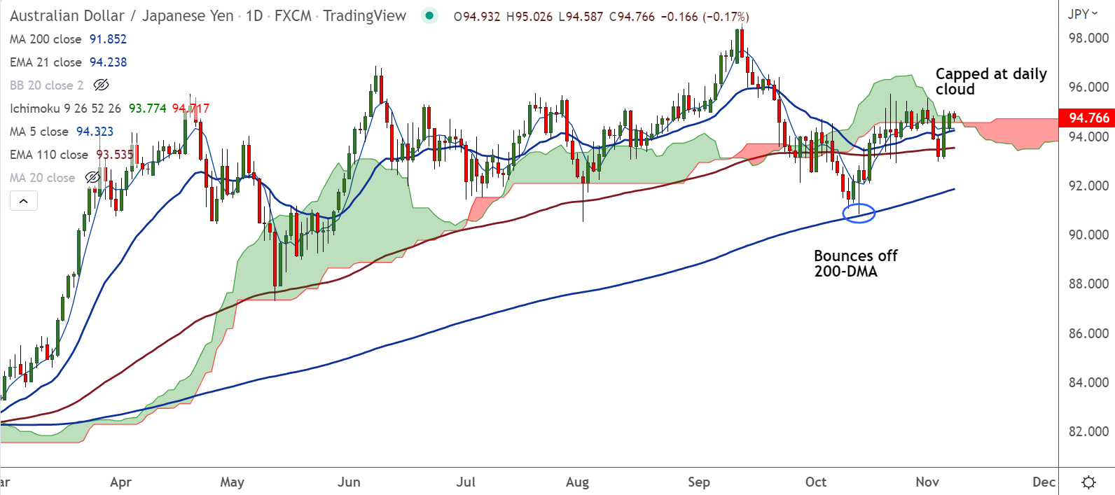 AUD/JPY was trading 0.18 lower on the day at 94.75 at around 09:55 GMT.