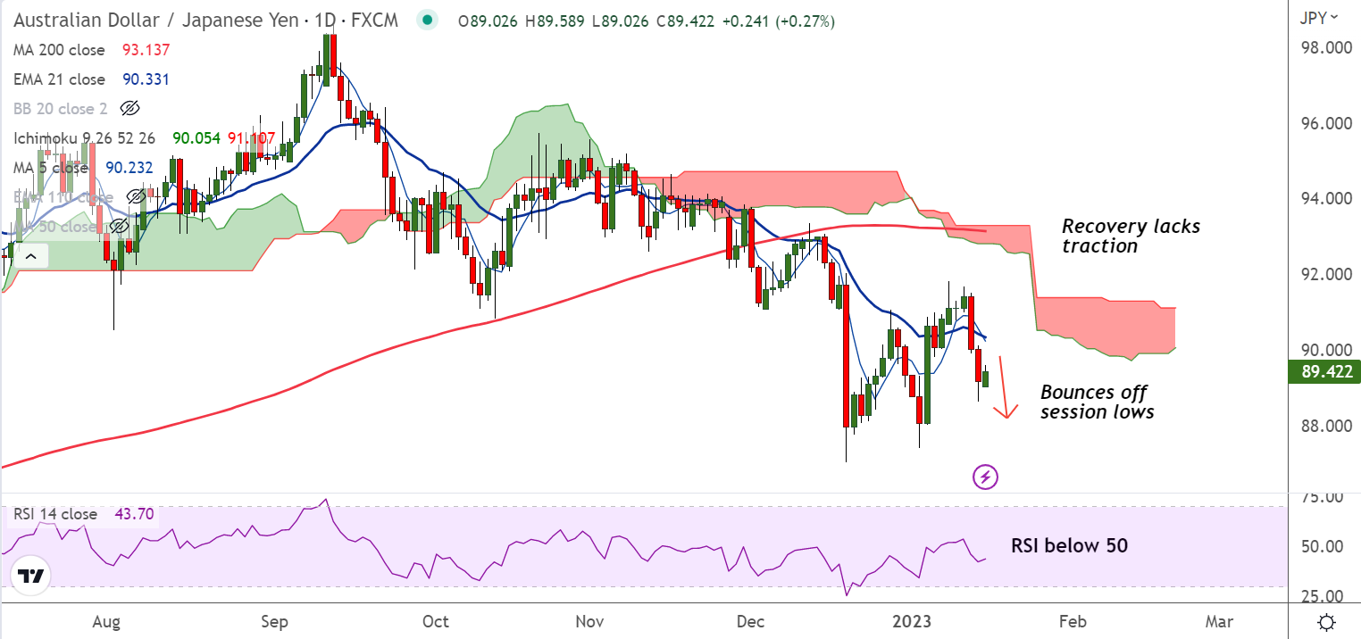 AUD/JPY has snapped a 2-day downside and was trading 0.19% higher on the day at 89.34 at around 14:00 GMT.