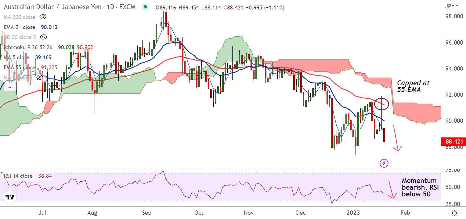 Summary: AUD/JPY trades with a bearish bias. Dip till 110-week EMA at 87.21 likely. Further weakness only on break below.