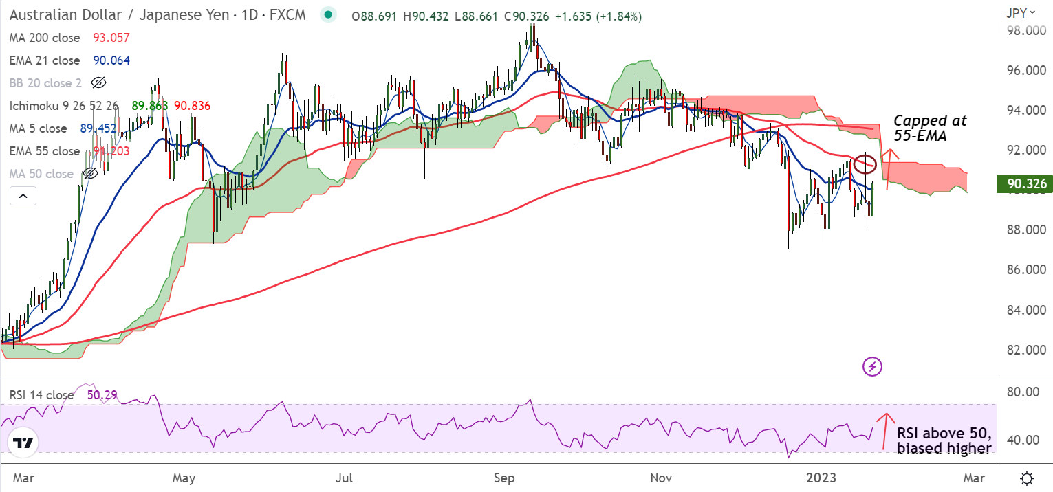 Summary: AUD/JPY is poised for further upside. The pair is on track to test 55-EMA resistance. Decisive break above 55-EMA required for upside continuation.