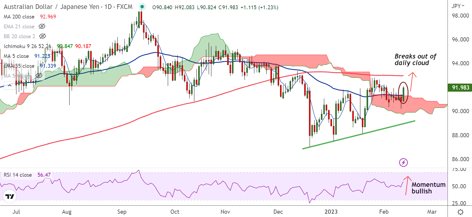 - AUD/JPY was trading 1.30% higher on the day at 92.04 at around 13:20 GMT