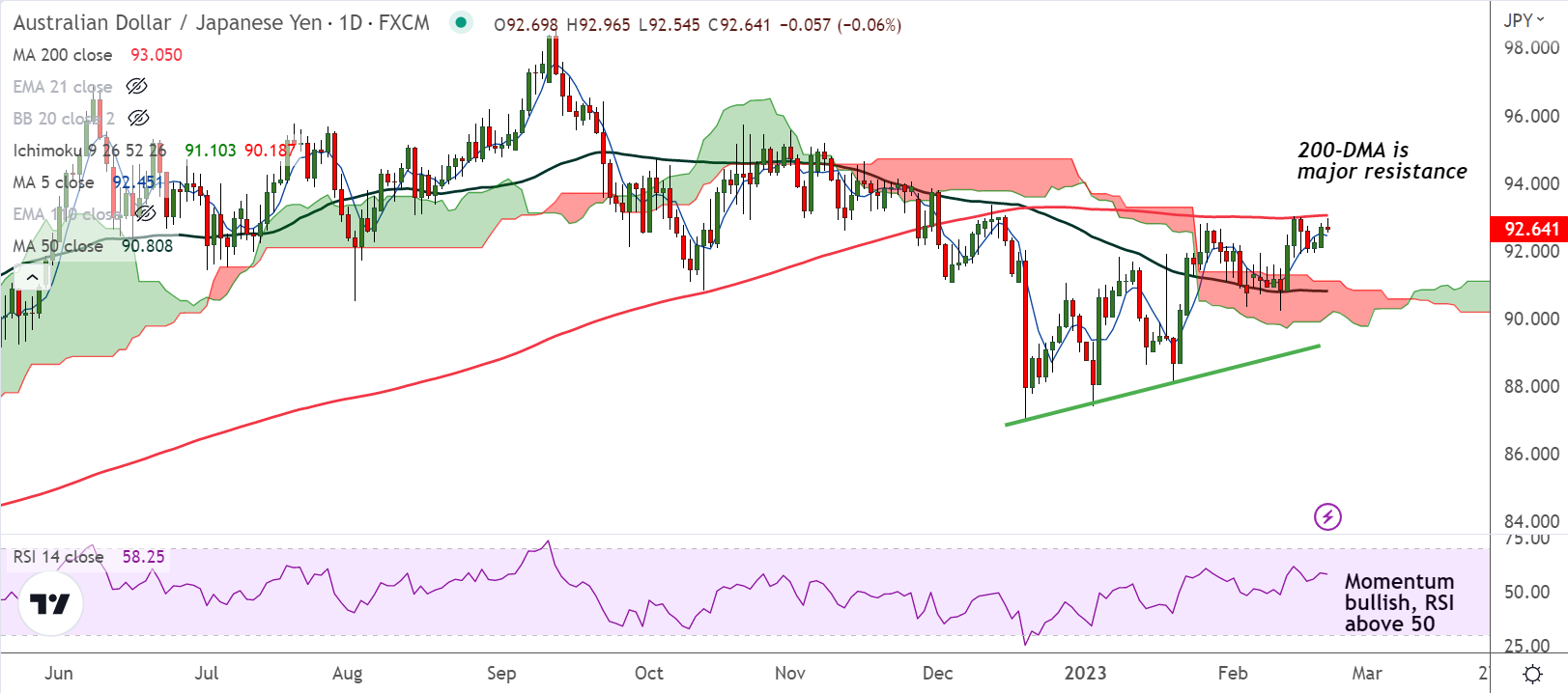 AUD/JPY was trading 0.04% lower on the day at 92.66 at around 11:55 GMT, 200-DMA caps upside.