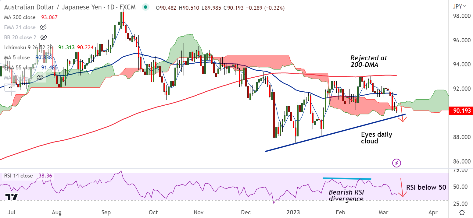 Summary: AUD/JPY trades with a bearish bias. Scope for test of trendline support at 89.75. Retrace above daily cloud will negate any further downside.