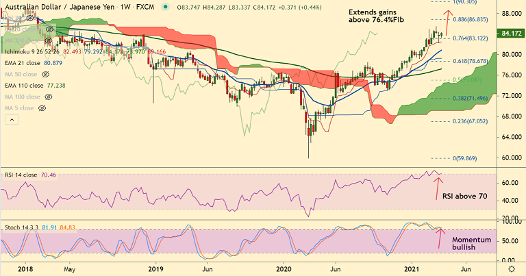 Support levels - 83.79 (20-DMA), 83.51 (21-EMA), 83.37 (5-DMA)