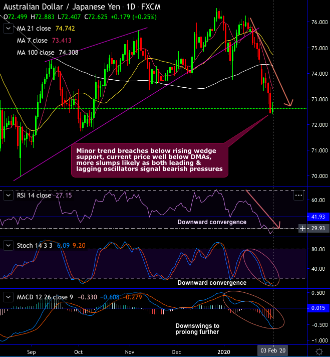 Technically, the minor trend of this pair breaches below rising wedge support, consequently, the current price has gone well below 7, 21 & 100-DMAs (refer daily chart).