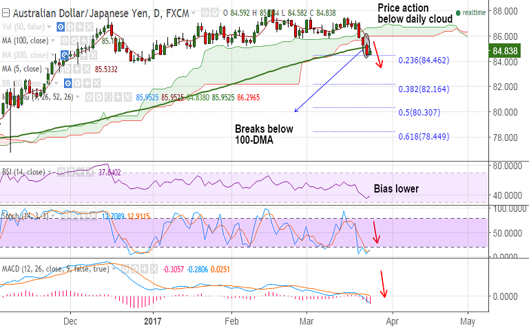 - AUD/JPY has shown a decisive break below 100-DMA at 85.19.