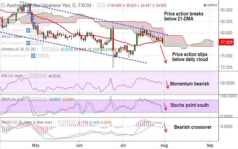 - AUD/JPY unable to break above stiff channel top resistance, downside now breaches 21-DMA support currently at 78.36.