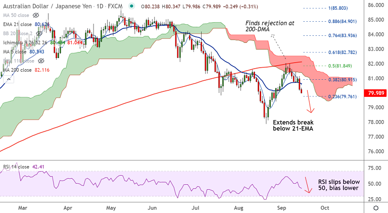 The pair is poised for further downside after rejection at 200-DMA and daily cloud. Scope for dip till 200-week MA at 78.48.