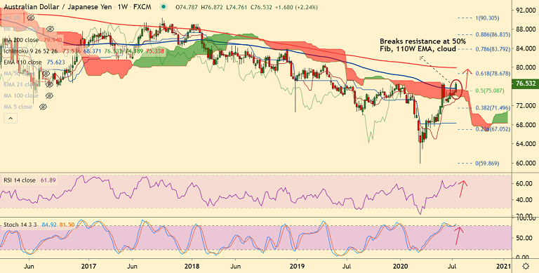 The pair has hit highest since May 2019 at 76.87 in the previous session and technical indicators support further upside.