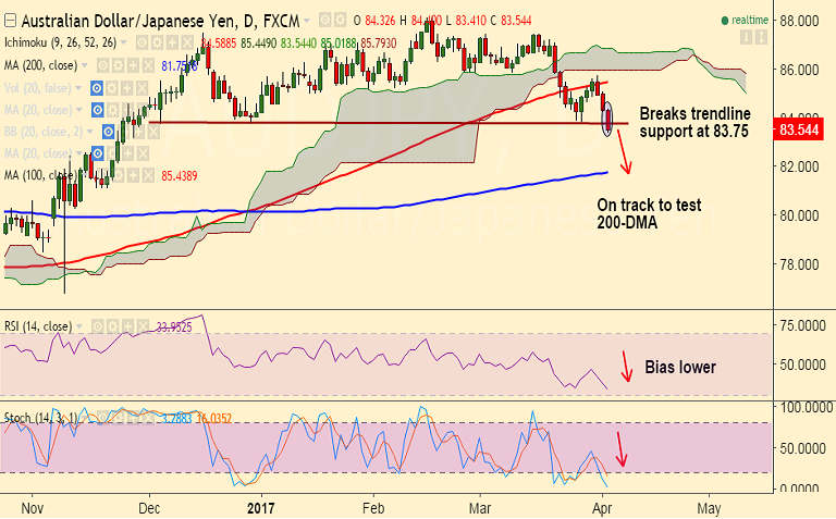 - Break below major trendline at 83.75 has opened scope for test of 200-DMA at 81.75.