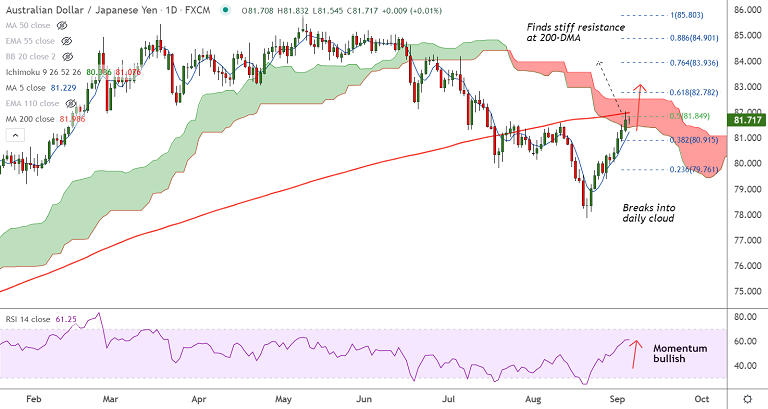 Next major hurdle for bulls above 200-DMA lies at cloud top at 82.52 ahead of 61.8% Fib at 82.78. Rejection at 200-DMA and retrace below 55-EMA negates any further upside.