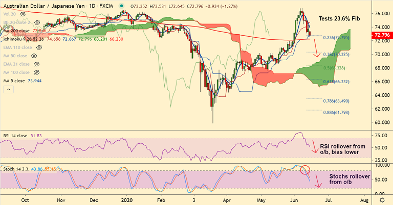 Bears have tested 23.6% Fib and are holding support at Kijun Sen at 72.66. Break below will see next major support at 200-DMA.