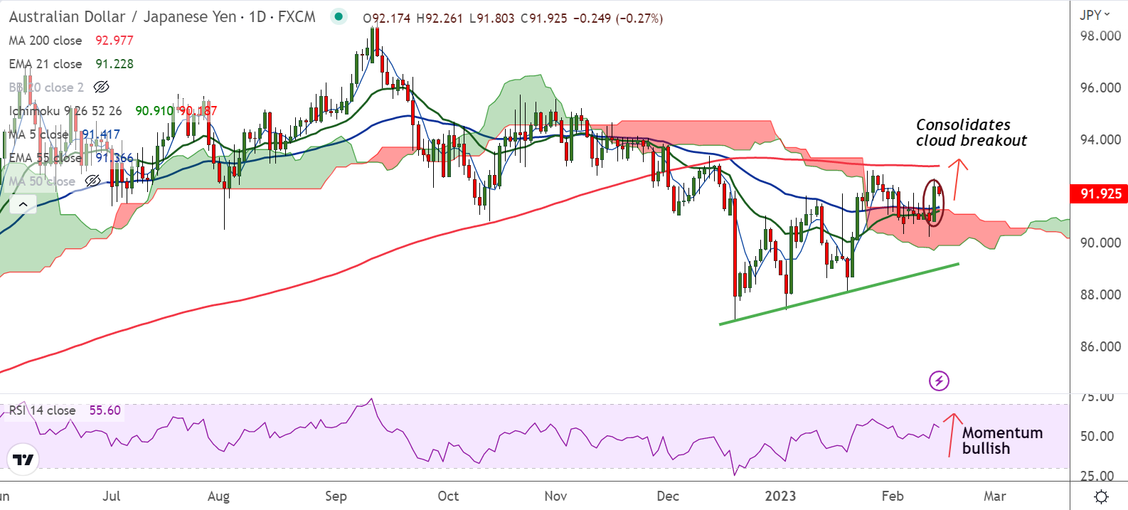 Summary: AUD/JPY has likely paused downtrend since September 2022 and has shown support at daily cloud. 200-DMA is next major resistance and decisive break above will see upside continuation.