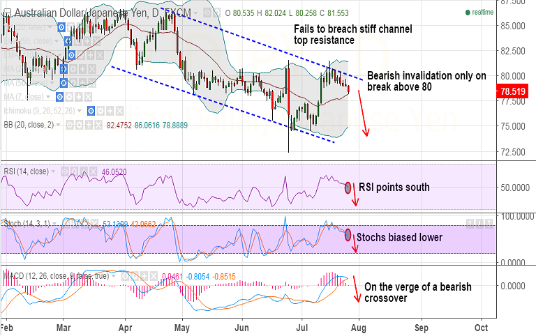 - AUD/JPY slides along stiff channel top resistance, downside pauses at 20-DMA support by 78.16.