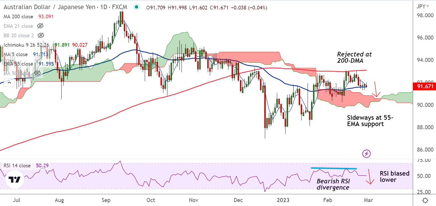 Summary: AUD/JPY struggles for direction at 55-EMA support. Break below will find next major support at daily cloud. Bullish continuation only above 200-DMA.