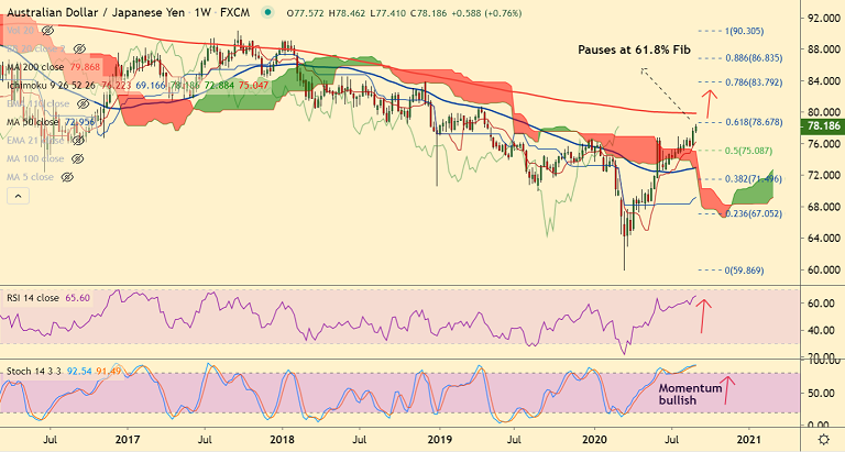 AUD/JPY was trading 0.10% higher on the day at 78.19 at around 11:05 GMT, outlook remains bullish.