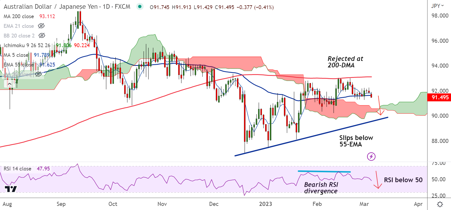 AUD/JPY was trading 0.41% lower on the day at 91.49 at around 12:03 GMT, bias is bearish.