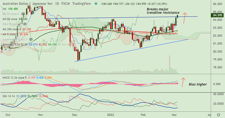 Progress in Ukraine-Russia peace talks and recovery in China’s covid conditions support risk-on, aiding upside in the pair.