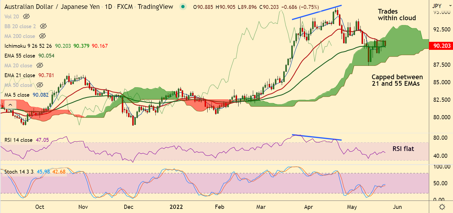AUD/JPY trades within the daily cloud. Price action remains capped between 21 and 55 EMAs.