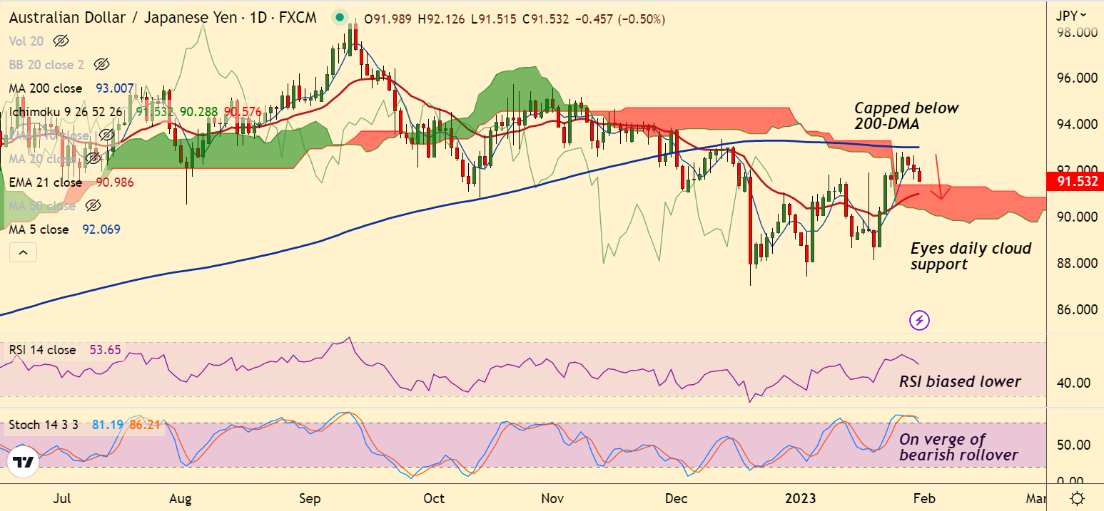 AUD/JPY was trading 0.46% lower on the day at 91.57 at around 06:10 GMT, near-term outlook is bearish.