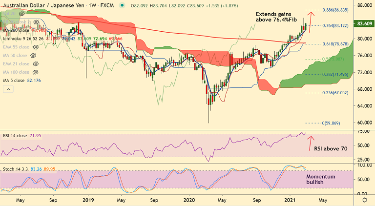 Momentum is bullish, volatility is rising, bulls likely to retest 200-month MA at 84.66. Decisive break above will propel the pair higher.