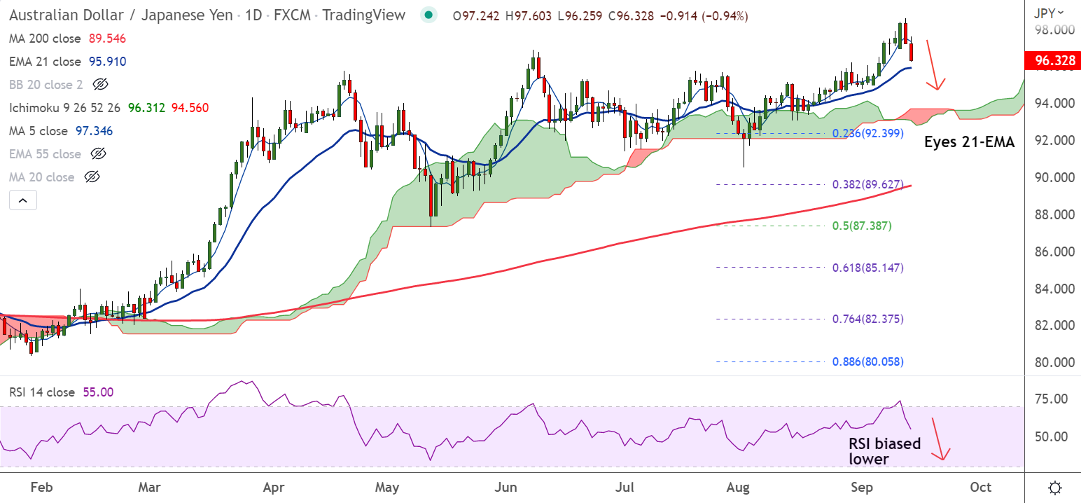 AUD/JPY was trading 0.95% lower on the day at 96.32 at around 11:10 GMT.