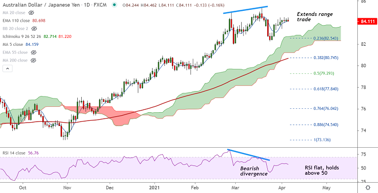 AUD/JPY grinds sideways for the 3rd straight session, hovers around 5-DMA support.
