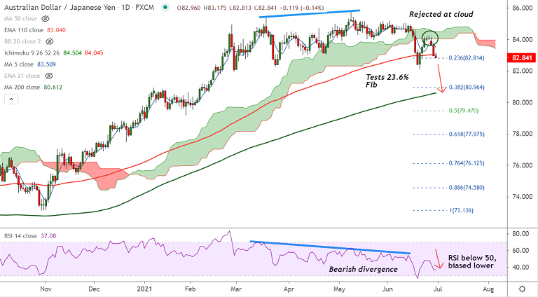 Summary: AUD/JPY trades with a bearish bias. Price action was rejected at daily cloud and is on track for further downside. Bearish invalidation above daily cloud.