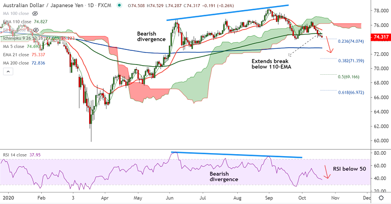 - The pair extends break below 110-EMA support, down for the 7th straight session