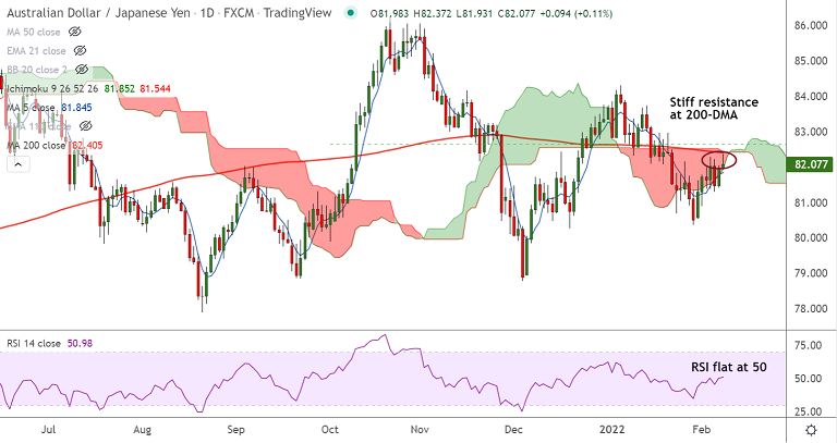 Summary: AUD/JPY struggles at 200-DMA resistance. Technical indicators do not provide a clear directional bias. Break above 200-DMA will change near-term dynamics.