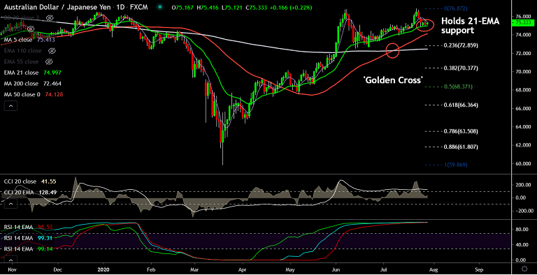 The pair is retreating from multi-month highs at 76.87 hit on July 22nd trade. 21-EMA is currently offering strong support at 74.99.