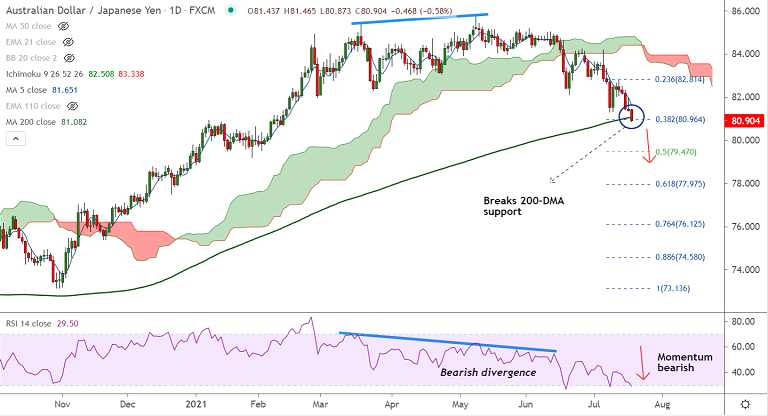 The pair has breached major support at 200-DMA at 81.08, raising scope for further downside.