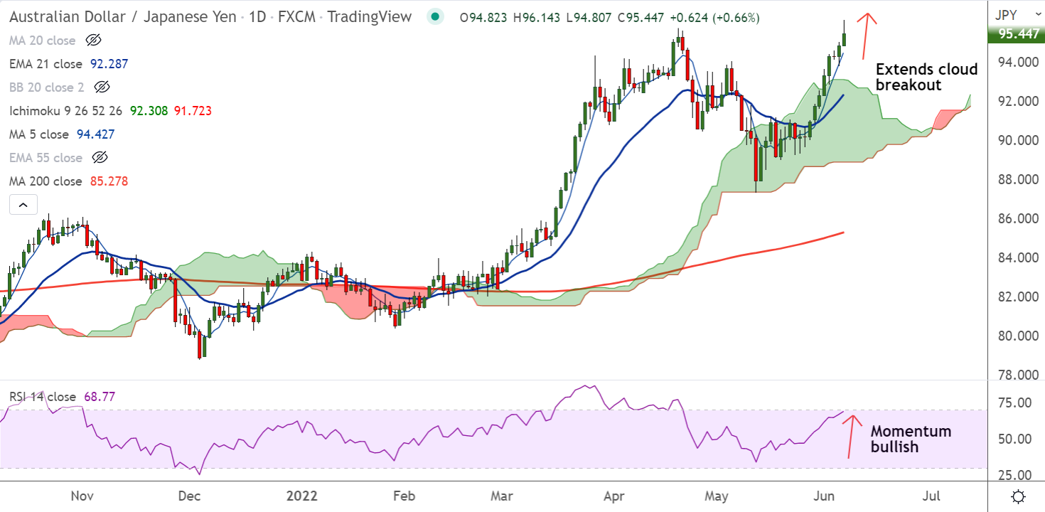 - AUD/JPY extends break above daily cloud, Chikou span is biased higher