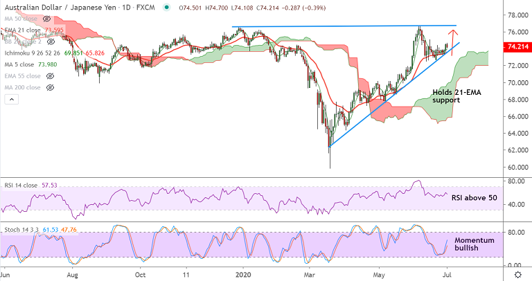 The pair trades above 200-DMA and daily cloud and major trend is bullish as evidenced by GMMA indicator.