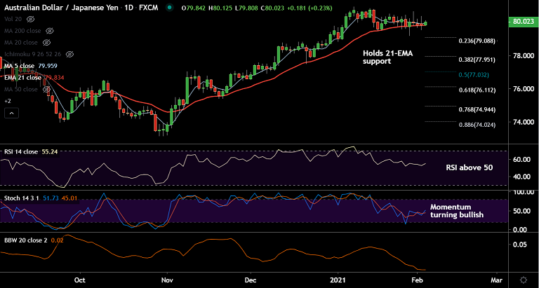 AUD/JPY was trading 0.27% higher on the day at 80.052 at around 09:50 GMT. The pair has held strong support at 21-EMA and any weakness likely only on break below.