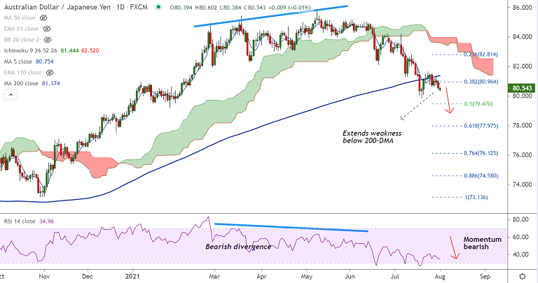Summary: AUD/JPY trades with a bearish bias. A dovish RBA on Tuesday could trigger further weakness.