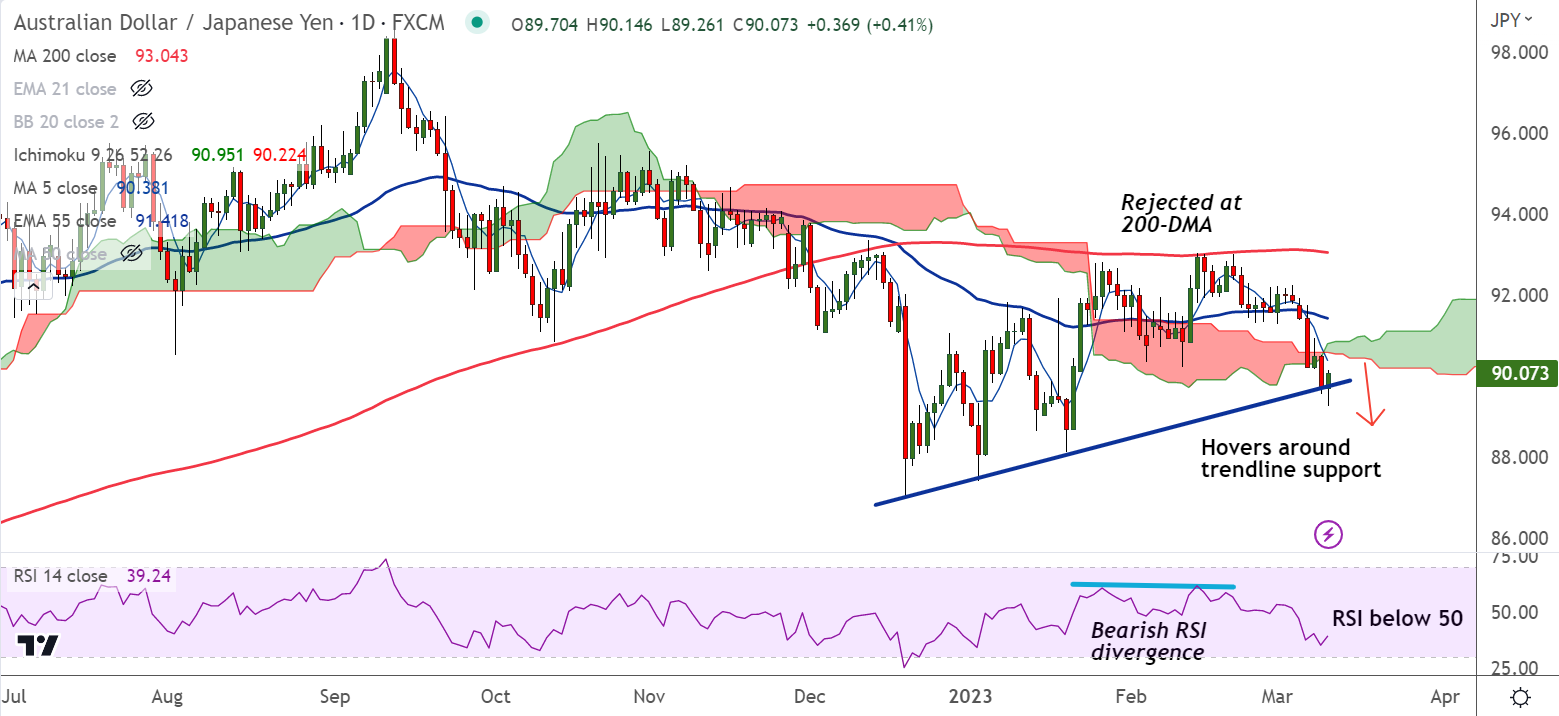 The pair is hovering around strong trendline support at 89.75, break below will see more downside.