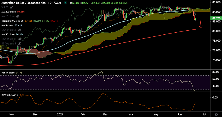 AUD/JPY was trading 0.40% higher on the day at 82.74 at around 10:00 GMT. The pair has paused 4 straight session's of downside, but outlook remains bearish.