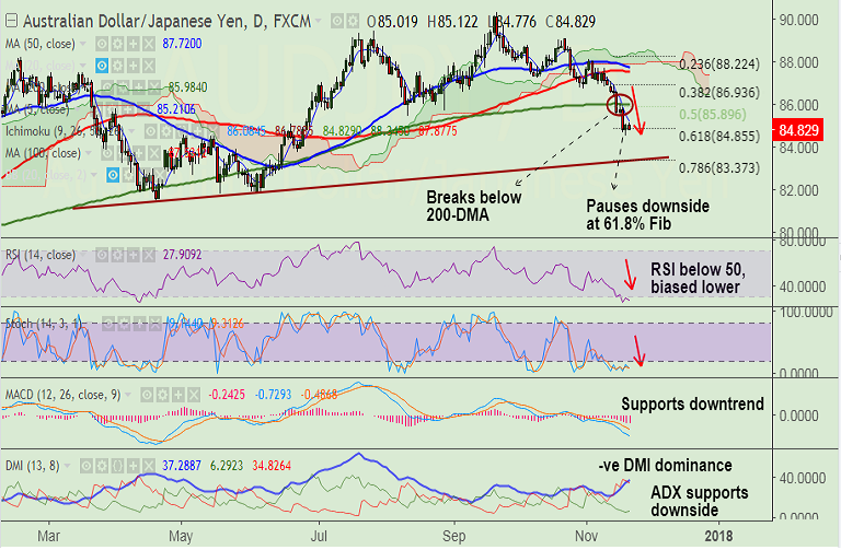 - AUD/JPY is hovering around 61.8% Fibo at 84.85, break below will accentuate weakness.