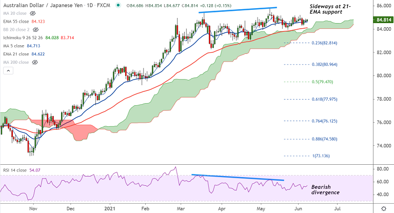 AUD/JPY was trading 0.22% lower on the day at 84.691 at around 10:00 GMT, after closing 0.47% higher in the previous session.