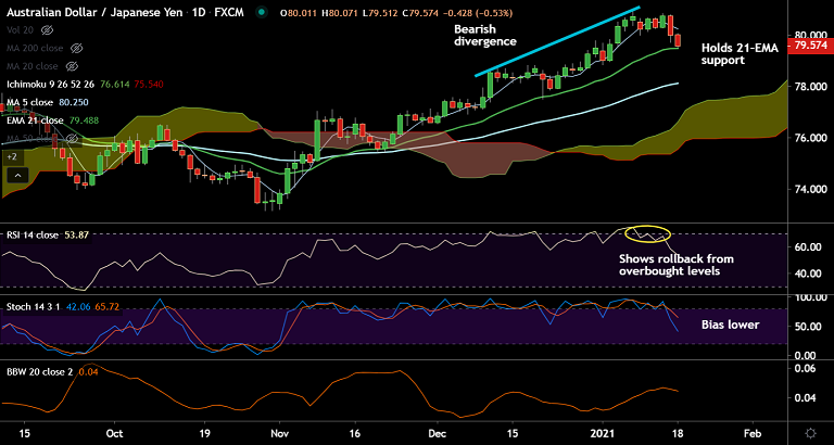 Major trend is bullish, but break below 21-EMA could drag the pair lower. Next bear target lies at 55-EMA at 78.12.