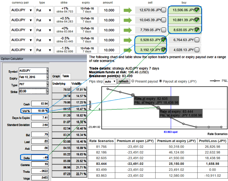 As we expect the underlying currency exchange rate of AUDJPY to make a larger move on the downside. As shown in the figure go long in 3 lots of different striking put options and simultaneously short 4D (0.5%) in the money put option and one more 1W (1%) in the money put options (choose both short sides that should have positive theta and delta closer to zero).