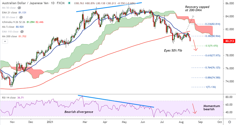 Summary: AUD/JPY resumes downside after rejection at 200-DMA, scope for further downside. The pair is on track to test 50% Fib retracement at 79.47. Bearish invalidation only above 200-DMA.