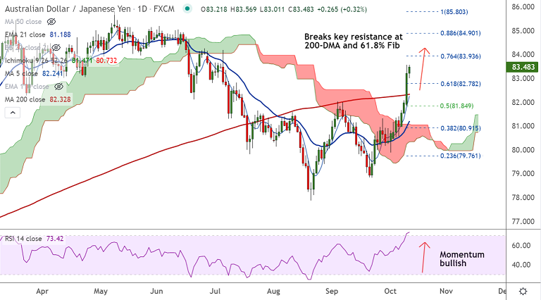 AUD/JPY was trading 0.35% higher on the day at 83.508 at around 10:10 GMT, outlook bullish.
