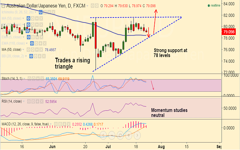 - The pair is trading a rising triangle pattern, finds strong support at 78 levels. Violation there could see downside upto 74.55.