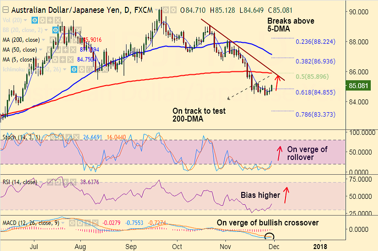 Support levels - 84.85 (61.8% Fib retrace of 81.48 to 90.30 rally), 84.75 (5-DMA), 84.35 (Nov 27 low), 84, 83.37 (78.6% Fib)
